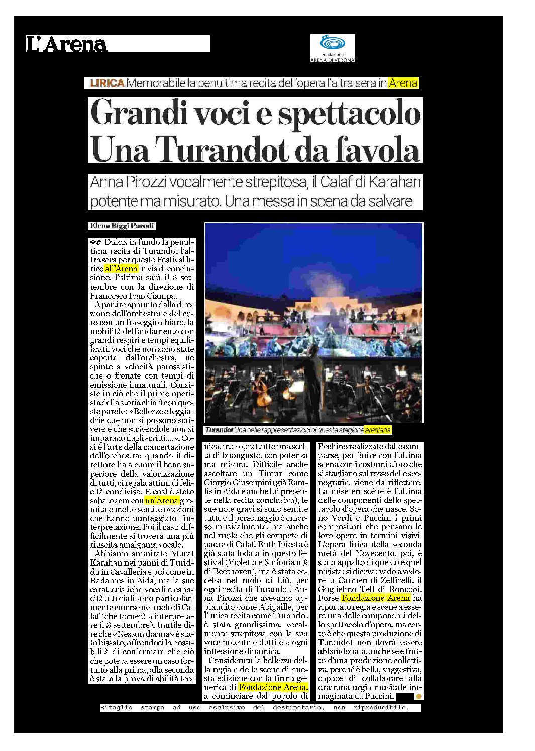 Ottobre 13, 2021 by Leonard Simaku in Recensioni “Anna Pirozzi che avevamo applaudito come Abigaille, per l’unica recita di Turandot, è stata grandissima” L’ARENA. 30.08.2021